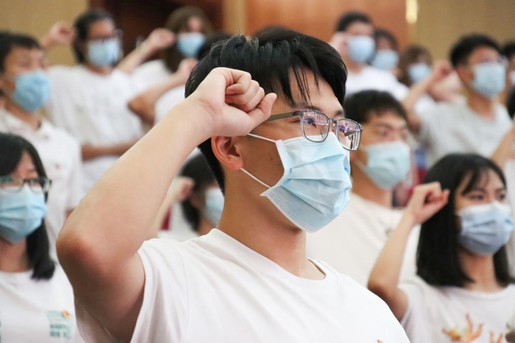 “我志愿加入中国共产主义青年团,坚决拥护中国共产党的领导,遵守团的章程,执行团的决议,履行团员义务,严守团的纪律,勤奋学习,积极工作,吃苦在前,享受在后,为共产主义事业而奋斗!”最后,在劳丹的带领下,全体团员起立宣读入团誓词,并集体合唱团歌,共同感受入团的庄严一刻。