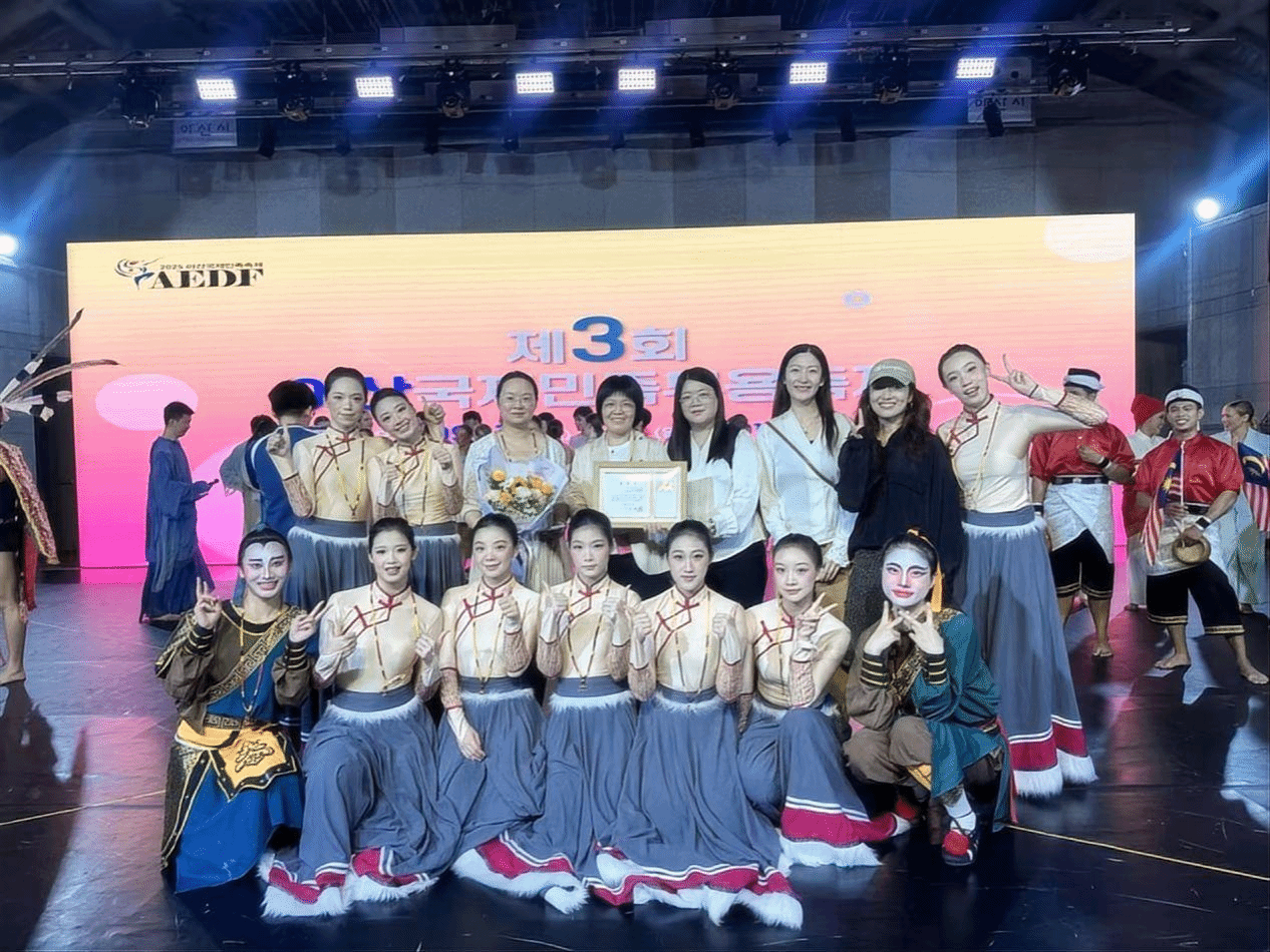 本次“莞工艺韵”舞蹈团的表演亮点纷呈。由孙海怡老师编创的汉族舞蹈《三秋打更》率先亮相,以梆子打更声为引,搭配富有诗意的肢体语言,将中原大地“秋收—守护—庆典”的时序故事缓缓铺展;李卉老师创编的原创作品则取材于广东潮汕地区极具代表性的“快板英歌”,鼓槌起落间,时而如惊雷乍响,时而沉稳定乾坤,尽显岭南英雄的豪迈气概;张贻华老师指导的藏族热巴鼓舞《天域》,凭借演员们自如挥舞的热巴鼓与悠长婉转的曲调,将青藏高原的神秘信仰与独特风情传递给现场每一位韩国观众。演出落幕时,现场掌声经久不息,牙山市文化福祉局长김만섭(KIM MANSEOP)为舞蹈团颁发“文化交流贡献奖”,以表彰其在文化交流中的突出表现。