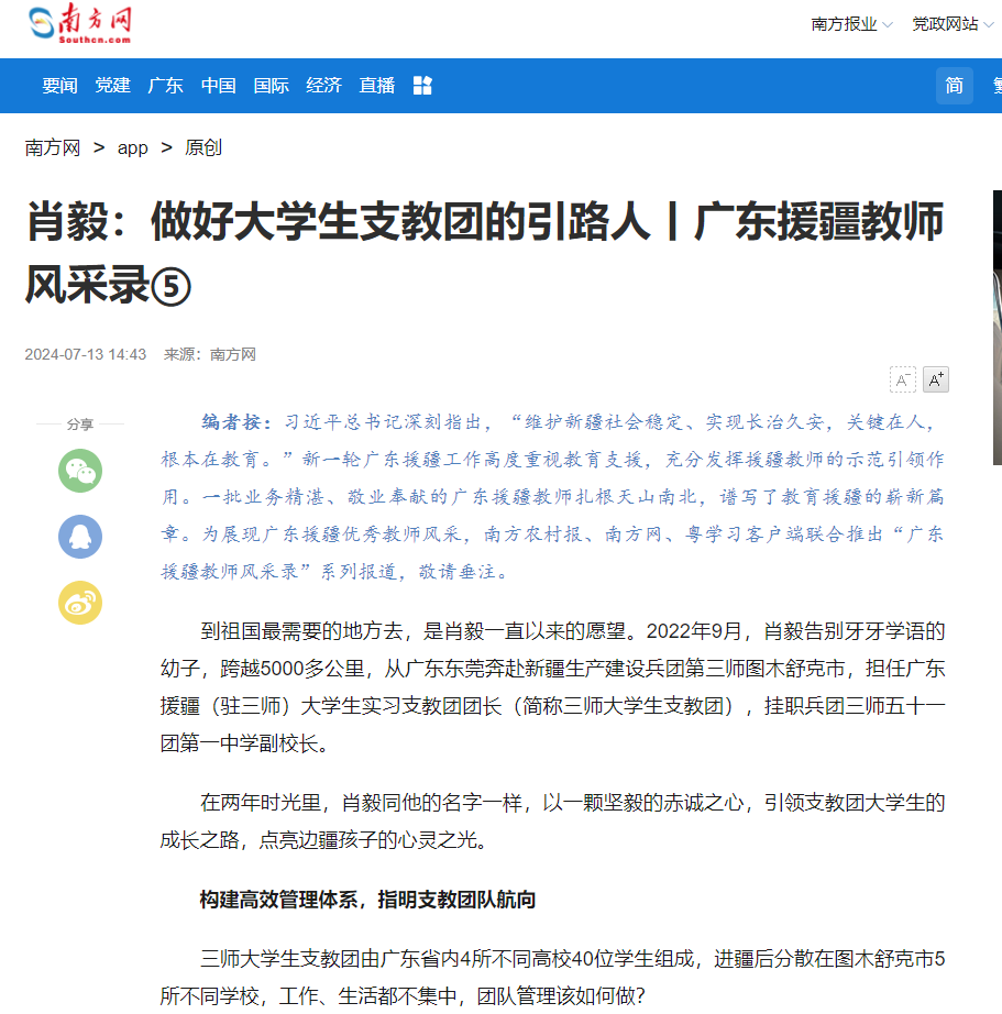 编者按:习近平总书记深刻指出,“维护新疆社会稳定、实现长治久安,关键在人,根本在教育。”新一轮广东援疆工作高度重视教育支援,充分发挥援疆教师的示范引领作用。一批业务精湛、敬业奉献的广东援疆教师扎根天山南北,谱写了教育援疆的崭新篇章。为展现广东援疆优秀教师风采,南方农村报、南方网、粤学习客户端联合推出“广东援疆教师风采录”系列报道,敬请垂注。