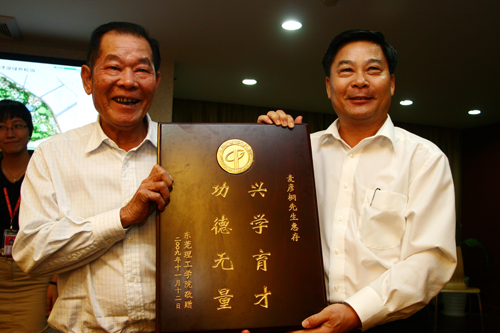 周致纳代表我校向广东鸿发集团投资有限公司董事长麦彦桐赠送纪念品。