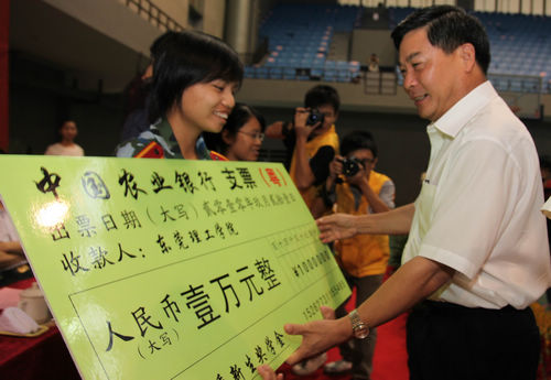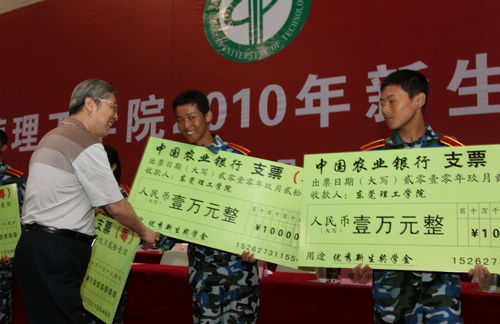 在2010级开学典礼上,校党委书记周致纳对获得乙等奖学金的8名同学进行了颁奖,他们各获得人民币1万元,其录取分数线均超过生源所在地一本省线。
