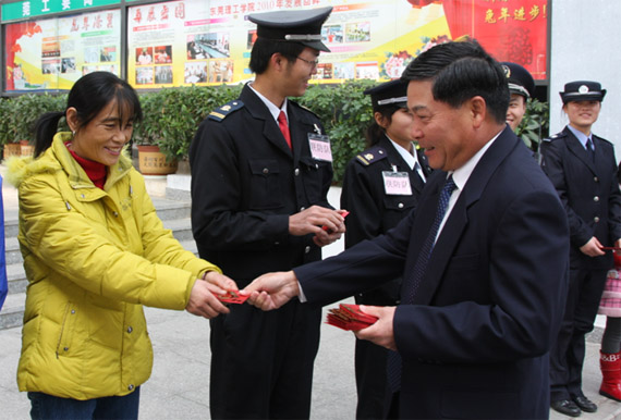 新年伊始,阳光明媚,春意盎然。2月3日(农历正月初一)早上,学校党委书记周致纳,校长杨晓西,党委委员、学校办公室主任李忠红等一行深入基层一线,亲切慰问了在学校坚守岗位的校卫队员、学生联防队员,后勤集团的员工和春节留住学校的学生,向他们致以节日的问候,并送上新春的祝福,祝愿大家在新的一年里百尺竿头,更进一步!
