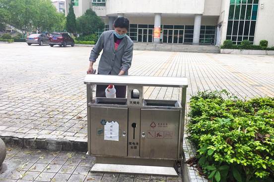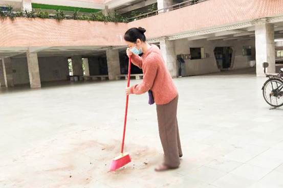 黄春菊是后勤管理办公室物业服务中心的一名保洁员小组长,来学校已有20个年头。疫情期间,她负责教工区(共10栋,每栋7-8层)所有楼梯清洁、电梯的消毒和保鲜膜的更换、教工区所有生活垃圾的清理、教工区一楼的公共区域清洁、部分路段的清扫。“大家都宅在家里,每天好几车垃圾,其他人都不愿意去校外,我是小组长没人愿意去的地方就由我去。”除此以外,她还担负起运动场和医务所的清洁工作。整个校园只有五个清洁工,除了本职工作,哪里需要帮忙的,其他人会立马赶过去,五人同心协力把工作做好。